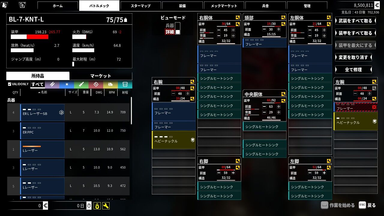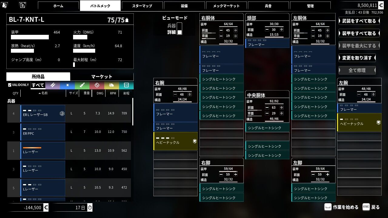 武器や放熱器、弾薬などはそれぞれの部位に載せる必要があるが