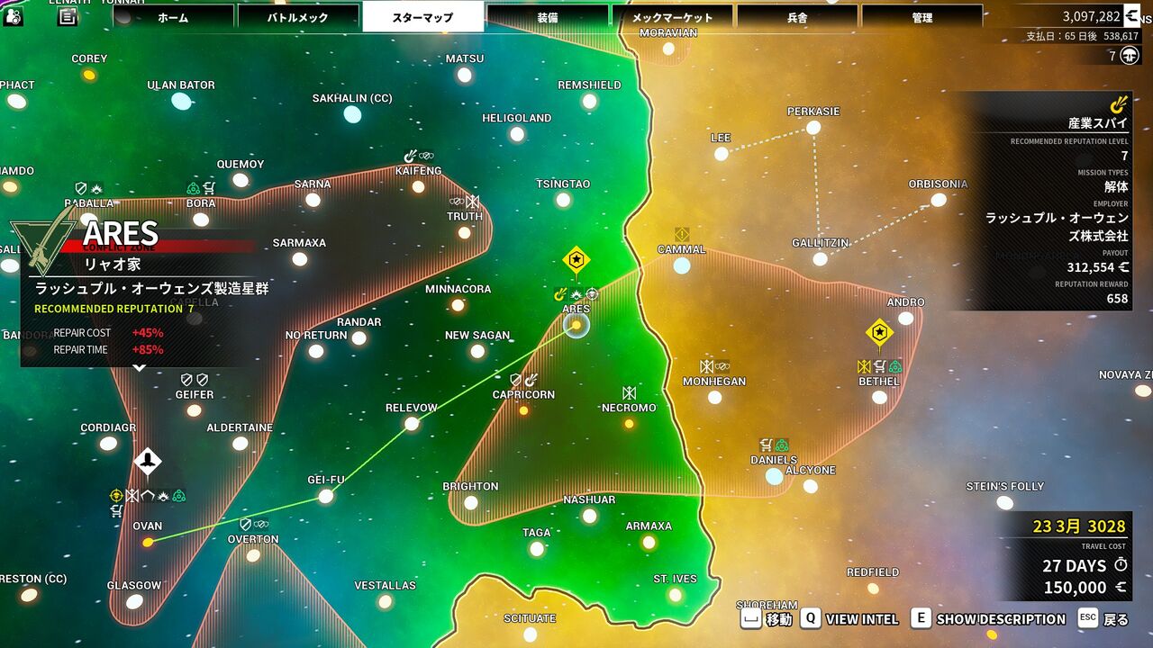 赤く囲まれた紛争地域と呼ばれるエリア内の星で任務を受注出来るが、