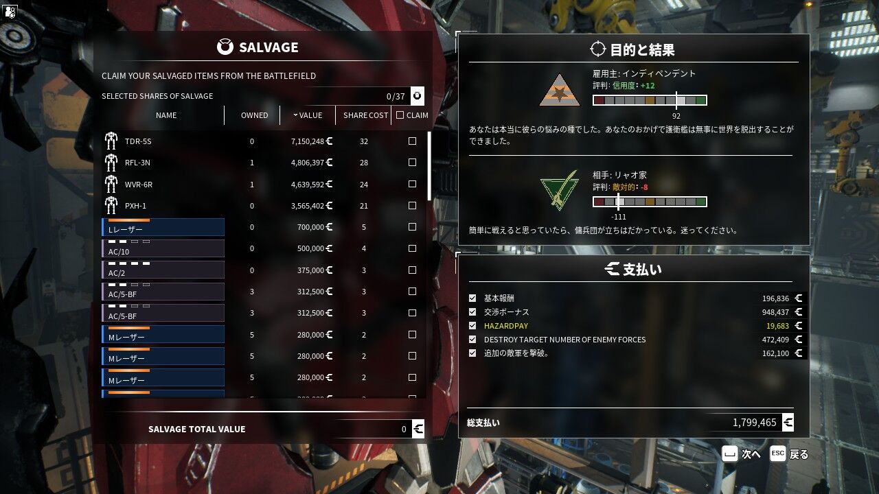 C-BILLの報酬よりも多いが、こちらは戦闘時の損害額までしか出ない。